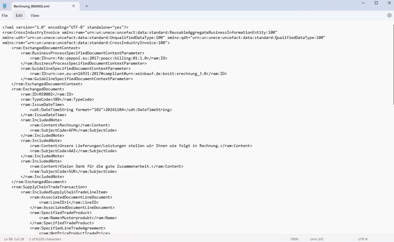 Eine XRechnung besteht aus Code-Zeilen. Wenn Sie sie herunterladen und mit einem Editor öffnen, sieht sie etwa so aus: