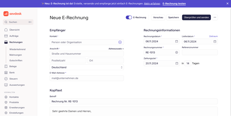 sevdesk unterstützt beide in Deutschland relevanten Rechnungsformate – XRechnung und ZUGFeRD. Sie können sie in der Rechnungsmaske auswählen, dann kümmert sich sevdesk um den Rest (sprich: die Generierung der XML-Datei).