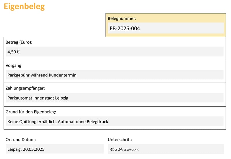 Wie sieht so ein Eigenbeleg in der Praxis aus? Hier sehen Sie ein einfaches Beispiel mit allen Pflichtangaben: