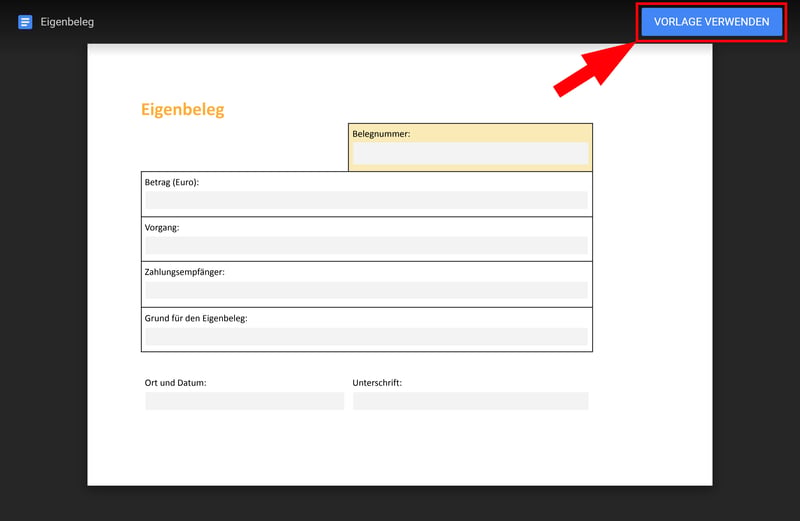 Beim Google Docs-Link gelangen Sie zu einer Online-Vorlage. Klicken Sie einfach oben rechts auf „VORLAGE VERWENDEN“, um eine eigene Kopie in Ihrem Google Drive zu erstellen. So können Sie den Eigenbeleg sofort im Browser ausfüllen und abspeichern.