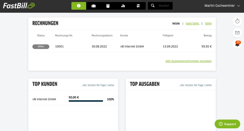 Die Rechnungsstellung steckt bei FastBill* schon im Namen, und tatsächlich finden wir den Funktionsumfang im Bereich Rechnungen wesentlich gelungener als jenen im Bereich Buchhaltung. Abstriche gibt es bei Letzterem vor allem, weil manche Berichte – darunter auch die GuV – nicht selbstständig im Programm erstellbar sind.