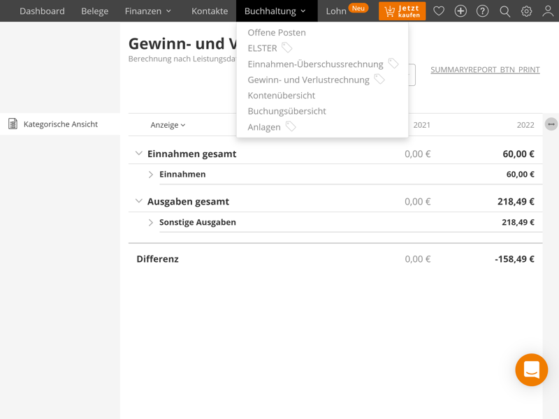Und: lexoffice ist eines der wenigen Buchhaltungsprogramme, die auch für die doppelte Buchhaltung einige Funktionen und Berichte im Gepäck haben. Dazu zählt auch die GuV, die Sie bei lexoffice im Menü Buchhaltung finden.
