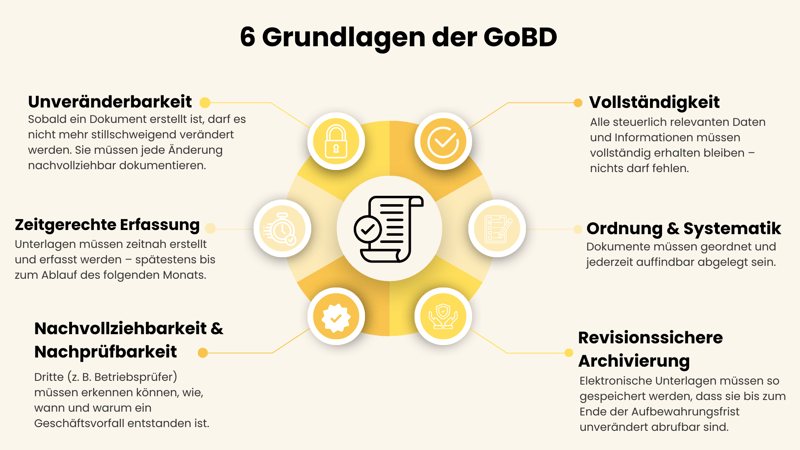 Am Ende geht es aber gar nicht darum, jede Einzelheit zu kennen. Entscheidend sind die Grundprinzipien – und die lassen sich in der Praxis recht einfach umsetzen. Im Kern kann man die GoBD auf sechs Grundsätze herunterbrechen: