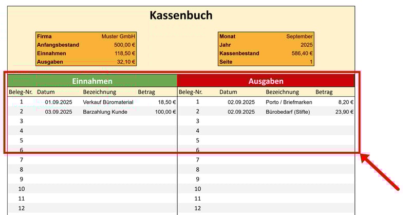 Nun können Sie damit beginnen, die täglichen Bargeldbewegungen einzutragen. Jeder Vorfall – ob Einnahme oder Ausgabe – muss lückenlos und in der richtigen zeitlichen Reihenfolge erfasst werden.