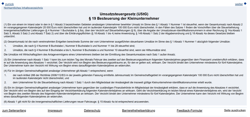 Wer von ihr Gebrauch macht, muss keine Umsatzsteuer auf seinen Rechnungen ausweisen und auch keine Umsatzsteuervoranmeldungen abgeben. Die Regelung ist in §19 des Umsatzsteuergesetzes (UStG) verankert.
