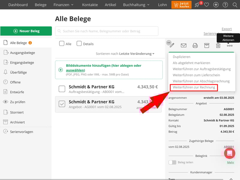 Wenn ein Kunde Ihr Angebot oder Ihren Kostenvoranschlag akzeptiert, müssen Sie zudem alle Angaben erneut manuell in eine Rechnung übertragen. Das ist nicht nur umständlich – es können sich auch schnell Fehler einschleichen, ganz zu schweigen von gesetzlichen Anforderungen wie der Pflicht zur E-Rechnung oder den GoBD-Vorschriften zur Archivierung.