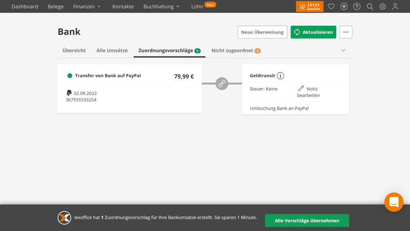 Unter Finanzen > Bank können Sie Ihre Bankkonten bei lexoffice einbinden. Unterstützt werden alle gängigen Giro- und Kreditkartenkonten, sowie Konten bei Kontist und PayPal. Wenn Ihr Konto verbunden ist, weisen Sie bestimmten Transaktionen entweder im Tab Nicht zugeordnet einen Beleg zu, oder sehen sich im Tab Zuordnungsvorschläge die Empfehlung von lexoffice an.