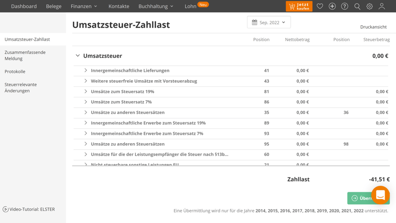 Letztere können Sie im Menüpunkt ELSTER erstellen, und von dort aus direkt an das gleichnamige Steuer-Programm weiterleiten.
