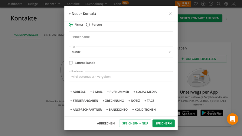 Kontakte: In diesem Bereich verwalten Sie Ihre Kunden- und Lieferantenkonakte.