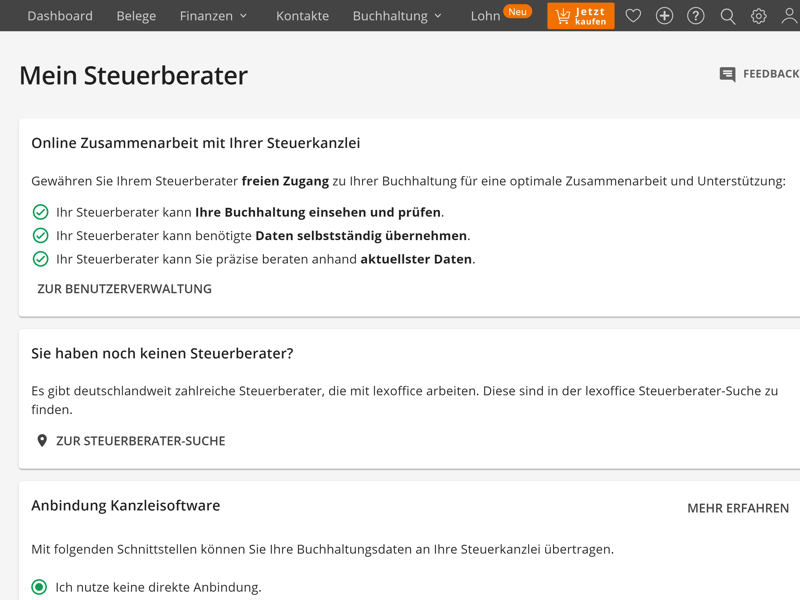 DATEV-Schnittstelle: Wie so ziemlich alle Buchhaltungsprogramme verfügt natürlich auch lexoffice über eine DATEV-Schnittstelle, über die Sie Ihre Buchhaltungsdaten an Ihre Steuerkanzlei übertragen können. Sie können Ihre Daten entweder ohne direkte Anbindung im DATEV-Format exportieren, oder die DATEV-Cloud-Services nutzen.