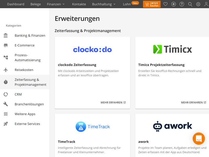 Die Zeiterfassung müssen Sie bei lexoffice kostenpflichtig als Erweiterung hinzubuchen.