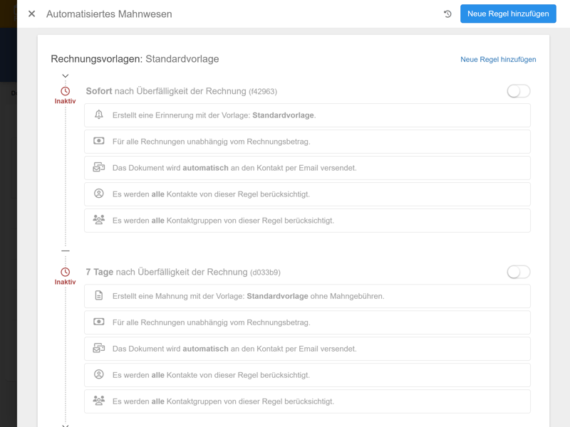 Viele Rechnungsprogramme unterstützen sogar automatisierte Mahnungen. Bei easybill können Sie beispielsweise Regeln festlegen, um nach Ablauf der Rechnungsfrist automatisch Zahlungserinnerungen zu verschicken. Diese Funktion ist allerdings nur im teuersten Tarif verfügbar.