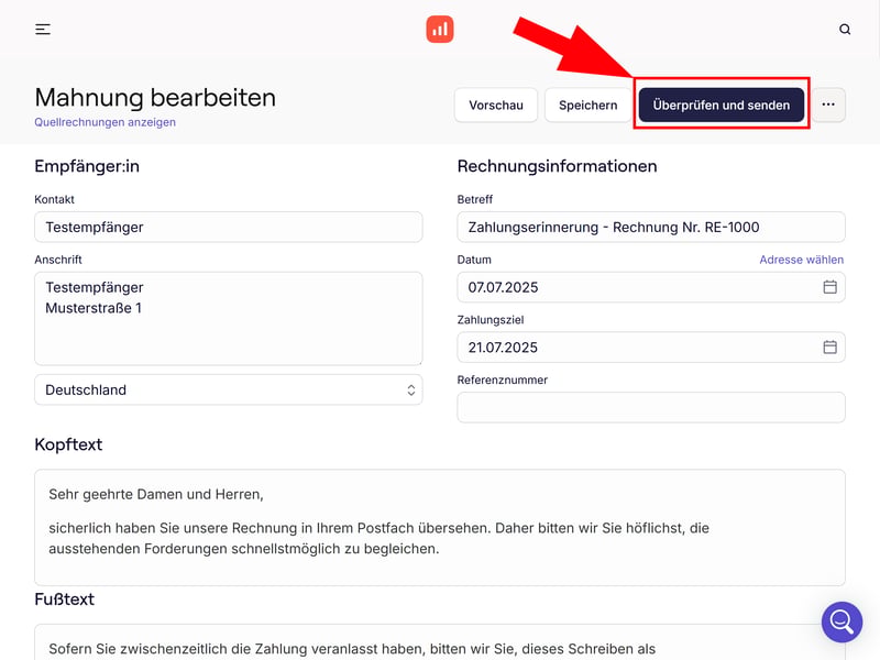 Schritt 4: Wenn Sie fertig sind, klicken Sie auf „Überprüfen und senden“, um die Mahnung abzuschicken.