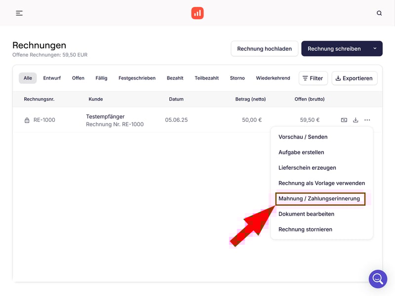 Schritt 2: Klicken Sie aufs Dreipunkte-Menü und wählen Sie „Mahnung / Zahlungserinnerung“ aus.
