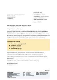 Wenn nach zwei Mahnungen immer noch keine Zahlung eingeht, bekommt Ihr Kunde mit der dritten Mahnung eine letzte Chance, die Angelegenheit ohne weitere Konsequenzen zu klären. Sie ist die letzte Zahlungserinnerung, bevor es ernst wird.