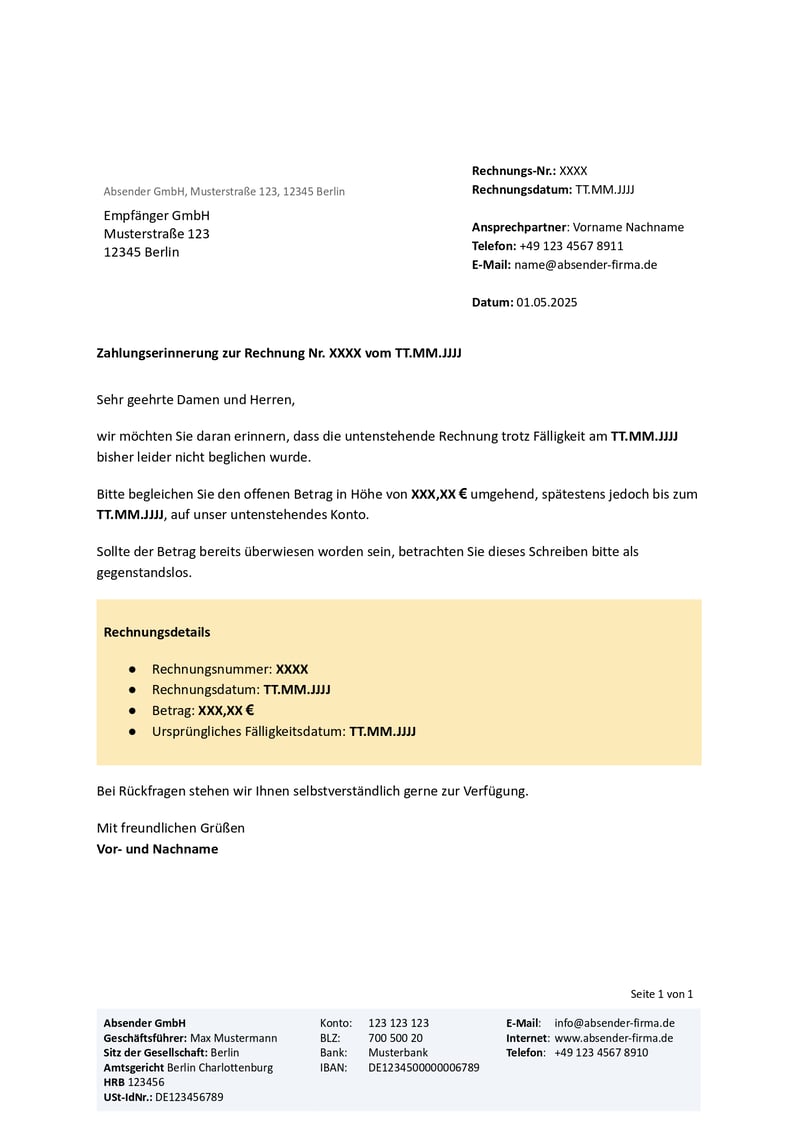 Titel | Ein aussagekräftiger Titel wie „Zahlungserinnerung“, „Zweite Mahnung“ oder „Letzte Mahnung“ |