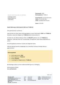 Wenn die Zahlungserinnerung ignoriert wird oder das Geld trotz der ersten Mahnung nicht auf Ihrem Geschäftskonto eingegangen ist, wird es Zeit für eine deutlichere Formulierung. Die zweite Mahnung ist immer noch sachlich, aber in Ton und Inhalt bereits bestimmter.