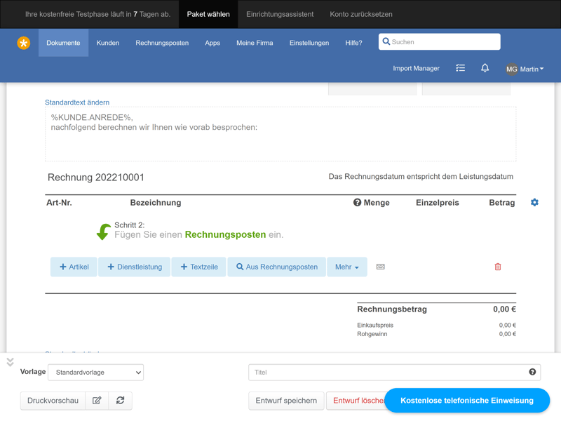 Um die Erstellung von Rechnungen zu beschleunigen, sollten Sie Ihre aktuellen Kunden, sowie Ihre angebotenen Leistungen und Produkte, vorab anlegen und speichern können, sodass Sie sie in der Rechnungsmaske nur noch auswählen müssen.Angebote und Kostenvoranschläge in Rechnungen umwandeln