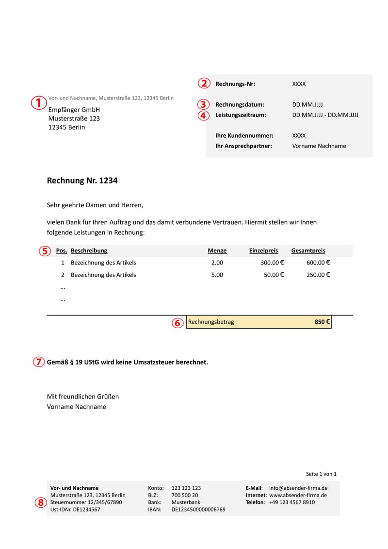 Folgende Angaben müssen auf jeder Kleinunternehmer-Rechnung enthalten sein: