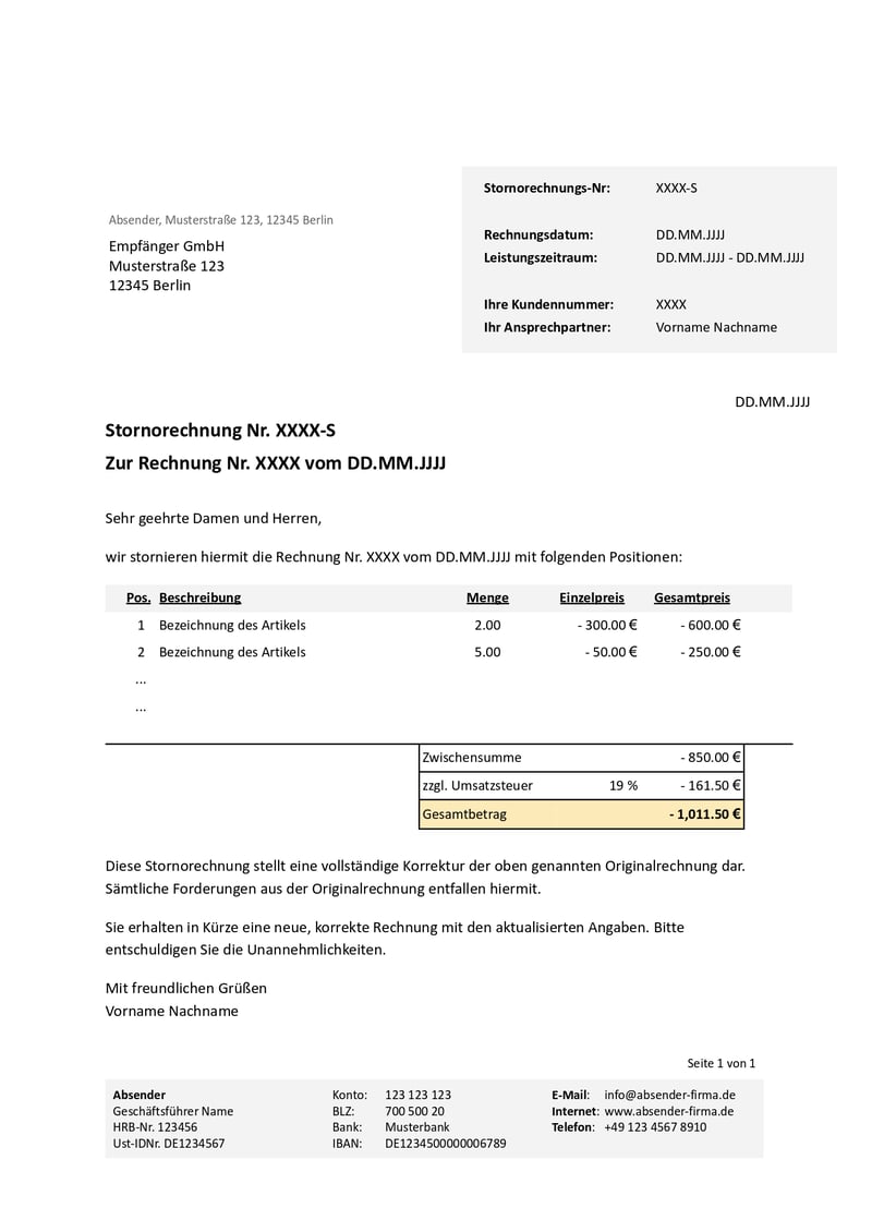 Eine Stornorechnung ist rechtlich gesehen ebenfalls eine Rechnung. Sie muss also alle Pflichtangaben enthalten, die auch für reguläre Rechnungen gelten.