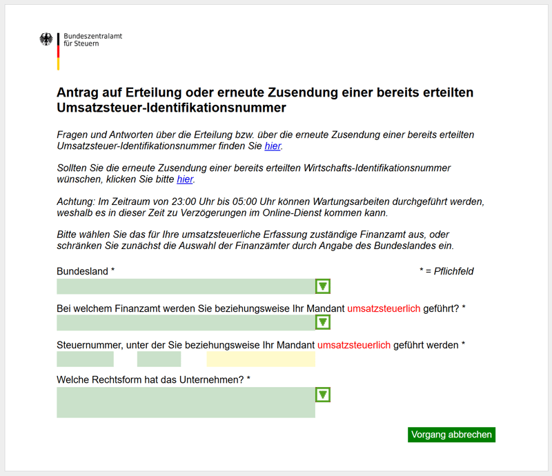 Das Online-Formular zur USt-ID-Beantragung ist selbsterklärend.