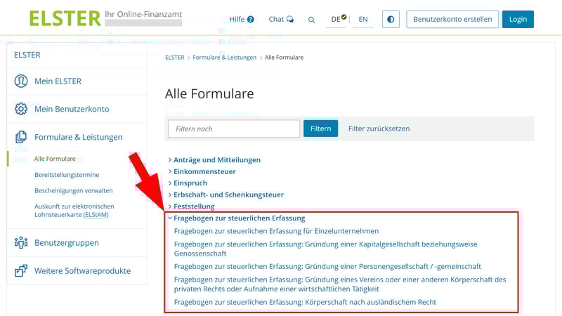 Sie können die Umsatzsteuer-ID direkt im Rahmen der Firmengründung (bzw. der Anmeldung Ihrer freiberuflichen Tätigkeit) beim zuständigen Finanzamt beantragen. Das geschieht über den Fragebogen zur steuerlichen Erfassung, den Sie online über ELSTER (das Portal der Finanzverwaltung) ausfüllen und einreichen.