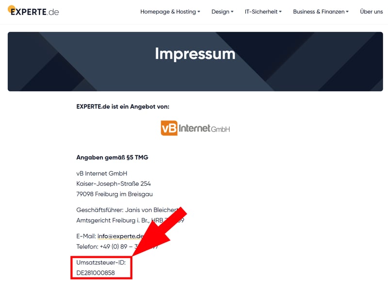 Wenn Sie die Angabe vergessen oder nicht richtig implementieren, riskieren Sie eine Abmahnung oder ein Bußgeld. Achten Sie also unbedingt darauf, Ihre USt-ID gut sichtbar im Impressum zu platzieren – wie hier bei EXPERTE.de:
