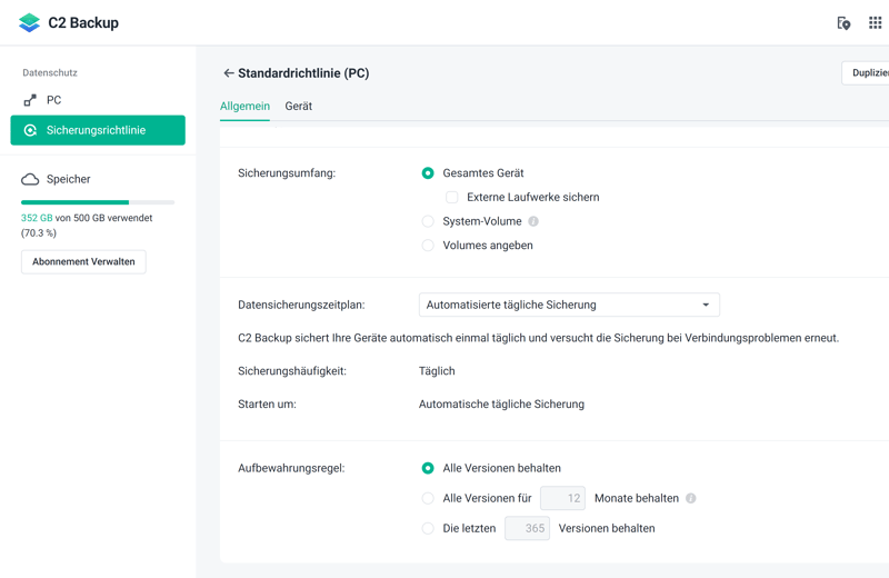 Mit dem Client legen Sie fest, welche Daten und welche Verzeichnisse Sie in die Cloud übertragen werden und wann das Backup stattfinden soll (beispielsweise jeden Montag um 23 Uhr).