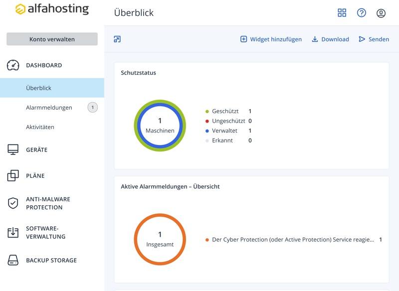 Anders sieht es aus, wenn Sie als Selbständiger oder als IT-Fachkraft für die Datensicherung eines kleinen Unternehmens zuständig sind. Dann benötigen Sie die richtigen Tools, um sich jederzeit einen Überblick über den Zustand der einzelnen Geräte verschaffen zu können. Alfahosting und alle auf der Acronis-Lösung basierenden Softwareprogramme bieten unter Übersicht beispielsweise eine Zusammenfassung der registrierten Geräte.