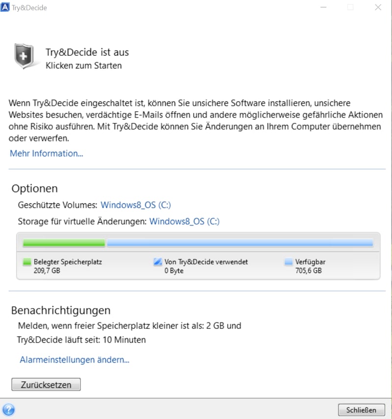 Schließlich bietet Acronis auch umfangreiche Sicherheitsfunktionen und fungiert auch als Antivirus-Software. Mit Try & Decide testen Sie sogar gefährliche Anhänge und machen im schlimmsten Fall alle Änderungen rückgängig.