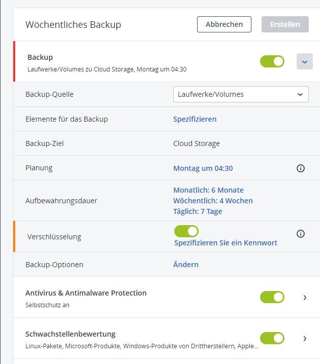 Je nach Software gibt es verschiedene Optionen, um Ihre Backups zu konfigurieren. Beispielweise können Sie bei manchen die Upload-Geschwindigkeit begrenzen, damit das Backup nicht Ihr komplettes Netzwerk lahmlegt. Auch den Speicherort Ihrer Dateien können Sie bei manchen Anbietern selbst bestimmen.