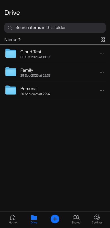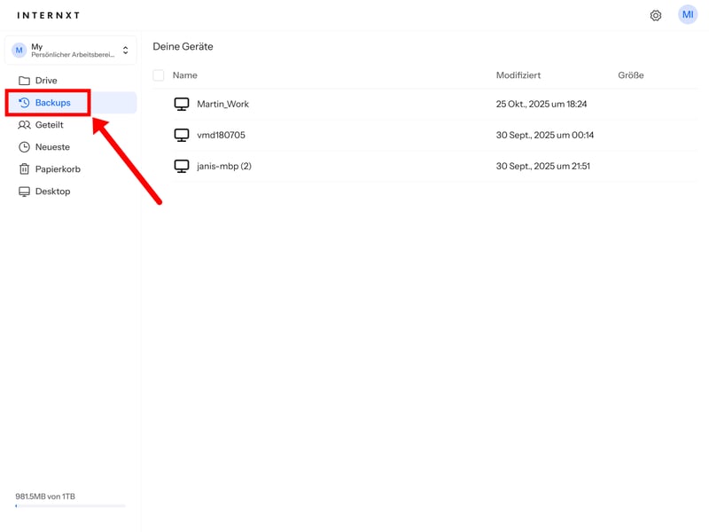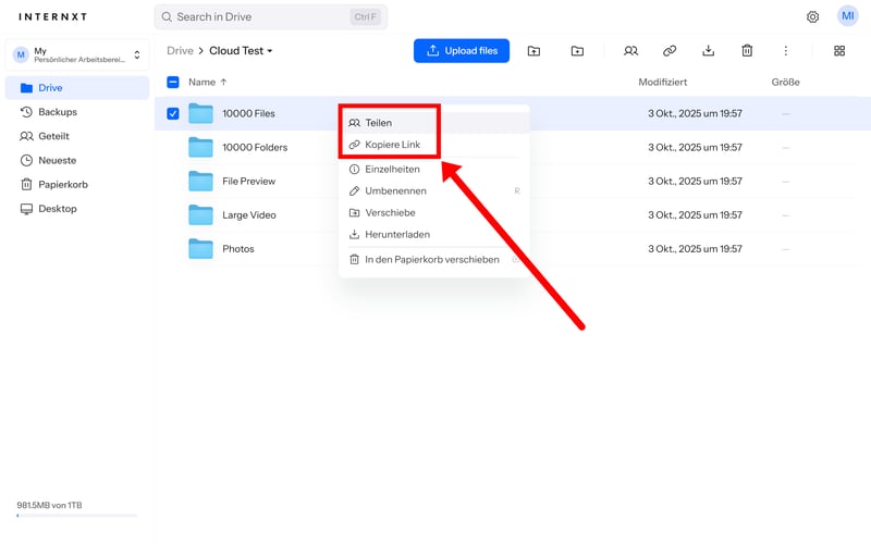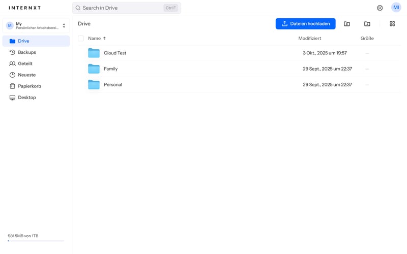 Nach dem Login landen Sie sofort in der Drive-Ansicht, in der alle gespeicherten Ordner aufgelistet sind. Über das Navigationsmenü in der linken Seitenleiste können Sie schnell zwischen den wichtigsten Bereichen wechseln: Neben Ihrem Drive finden Sie hier auch einen Backups-Ordner, einen Bereich für geteilte Dateien, eine Übersicht der neuesten Dateien und Ihren Papierkorb.