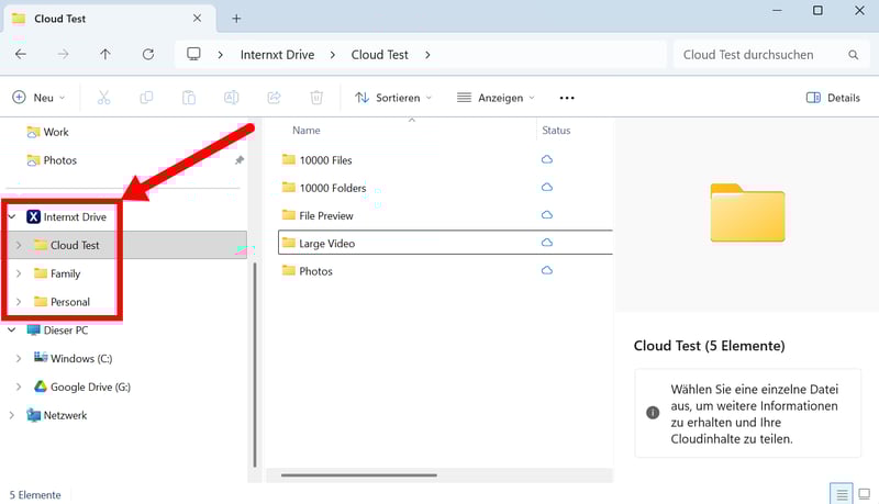 Beim Einrichten wird auf Ihrem Computer ein Internxt-Ordner angelegt, der wie ein gewöhnliches Laufwerk im Dateimanager angezeigt wird. Sie können Ihre Dateien also ganz normal öffnen, verschieben, kopieren oder löschen – mit dem Unterschied, dass sie zusätzlich online gespeichert werden.