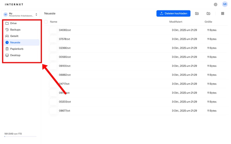 Über das Navigationsmenü links springen Sie zu den Bereichen Ihres Cloud-Speichers.