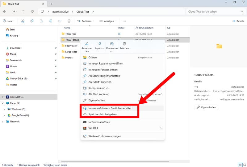 Im Test-Ordner befinden sich jeweils 10.000 Dateien, 10.000 Ordner, 100 Fotos (ca. 500 MB) und ein großes Video (ca. 500 MB).