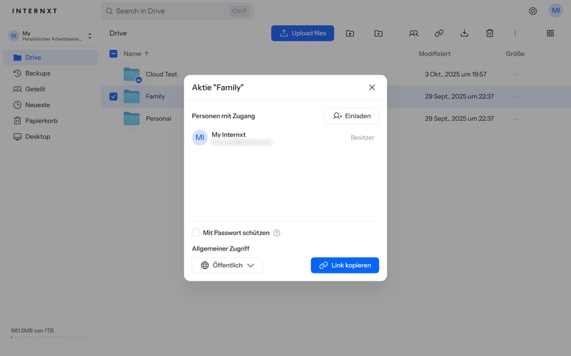Bei Internxt werden alle Dateien clientseitig verschlüsselt, bevor sie das Gerät verlassen. Nur Sie besitzen den Schlüssel – der Anbieter selbst hat laut eigenen Angaben keine Möglichkeit, Ihre Inhalte zu entschlüsseln.