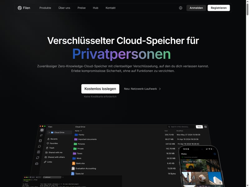 Filen ist ein deutscher Cloud-Speicher aus Recklinghausen, der mit hohen Sicherheitsstandards wirbt: Dank Ende-zu-Ende-Verschlüsselung nach dem Zero-Knowledge-Prinzip bleiben Ihre Daten selbst für den Anbieter unzugänglich.