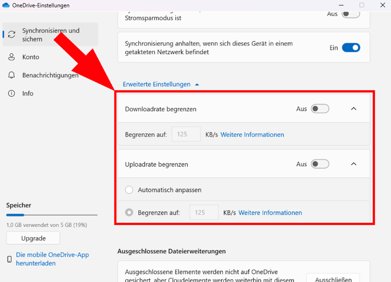 Weitere Einstellungen: Bandbreite begrenzen, Synchronisierung pausieren