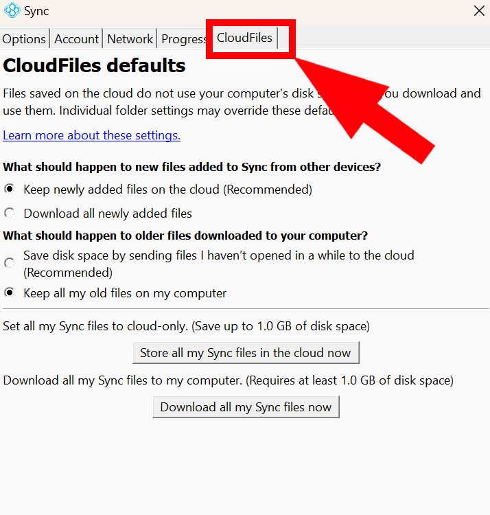 Alternativ können Sie auch einstellen, dass Sync.com alle neu hinzugefügten Dateien automatisch auf Ihr Gerät herunterladen soll. In den Einstellungen der Desktop-App können Sie im Reiter „CloudFiles“ festlegen, wie Sync.com standardmäßig vorgehen soll. Hier finden Sie auch die Option, ältere Dateien, die Sie schon länger nicht mehr geöffnet haben, in die Cloud zu senden und vom Gerät zu löschen: