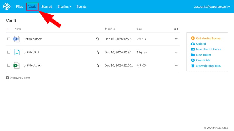 Im Files-Bereich, der am Desktop als Sync-Ordner bezeichnet wird, finden Sie alle Dateien in Ihrem Cloud-Speicher, die über eine 2-Wege-Synchronisierung zwischen der Cloud und Ihrem Computer synchronisiert werden.Vault