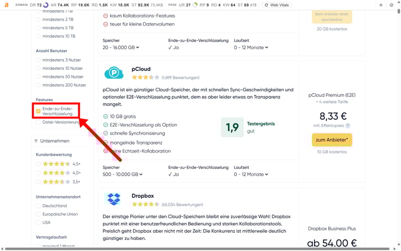Wenn Ihnen Datenschutz besonders wichtig ist, sollten Sie daher gezielt nach Anbietern suchen, die E2E-Verschlüsselung unterstützen. In unserem Cloud-Speicher-Vergleich können Sie nach dieser Funktion filtern und passende Anbieter auswählen:
