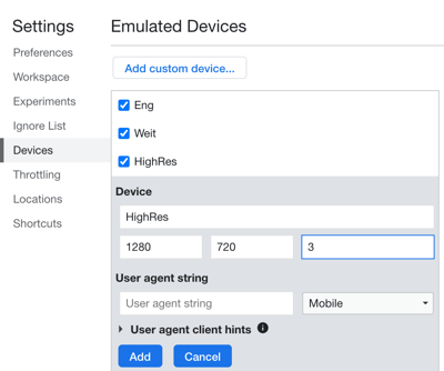 4. Wählen Sie Add custom device und erstellen Sie ein neues Gerät. Zuerst vergeben Sie unter Device Name einen Namen, beispielsweise 4K-Display. Die drei unteren Felder geben die Auflösung (Breite x Höhe) sowie das DPR des Zielgeräts an. Für einen 12-Zoll-Bildschirm legen Sie zum Beispiel die Werte 1024 x 768 und ein DPR von 3 fest.