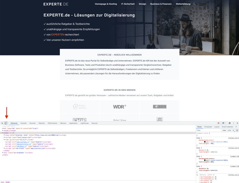 In der oberen Leiste auf Toggle Device Toolbar (Handysymbol) klicken. Dieses Werkzeug dient dazu, den Bildschirm in einem anderen Format (zum Beispiel im Format eines iPhone-Bildschirms) darzustellen.