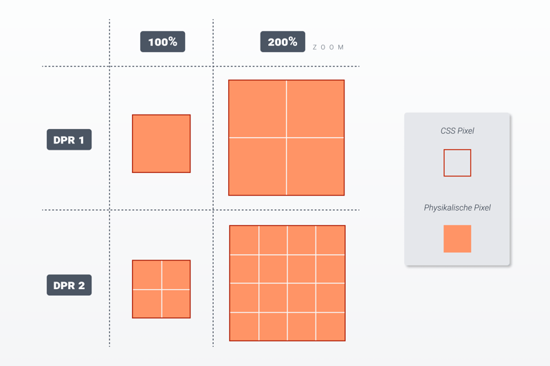 Verwandt, aber nicht gleich bedeutend, ist der Begriff Device Pixel Ratio (DPR). Diese Größe gibt das Verhältnis zwischen CSS Pixeln (den Pixeln im HTML-Code, einer reinen Maßeinheit) und physikalischen Pixeln (den tatsächlichen Pixeln, die ein Gerät darstellen kann) an. Zoomt man beispielsweise in ein Bild mit einer Größe von 200 CSS-Pixeln herein, nimmt es mehr Platz auf dem Bildschirm ein. Die Breite in physikalischen Pixeln erhöht sich, in CSS-Pixeln bleibt sie jedoch 200. Der Zoomeffekt entsteht dadurch, dass die CSS-Pixel gedehnt werden. Je mehr man zoomt, desto mehr physikalische Pixel passen in ein CSS-Pixel hinein.