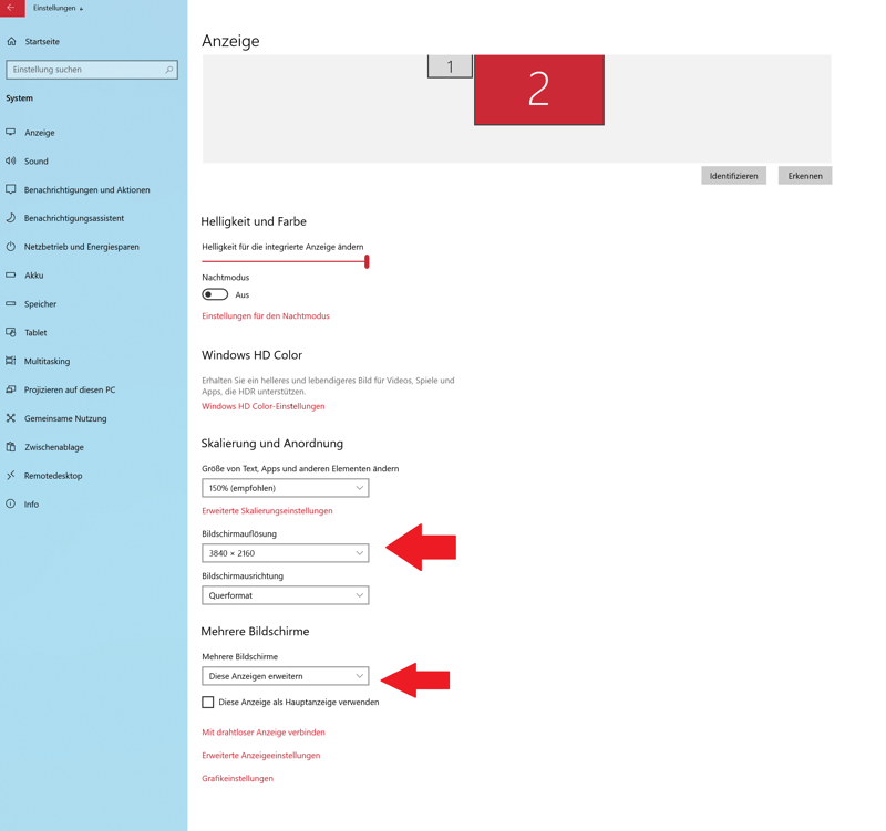 Richten Sie in Windows unter Einstellungen > System > Anzeige den zweiten Bildschirm ein. Dazu scrollen Sie herunter auf Mehrere Bildschirme und wählen im Dropdown-Menü die Option Diese Anzeigen erweitern aus.