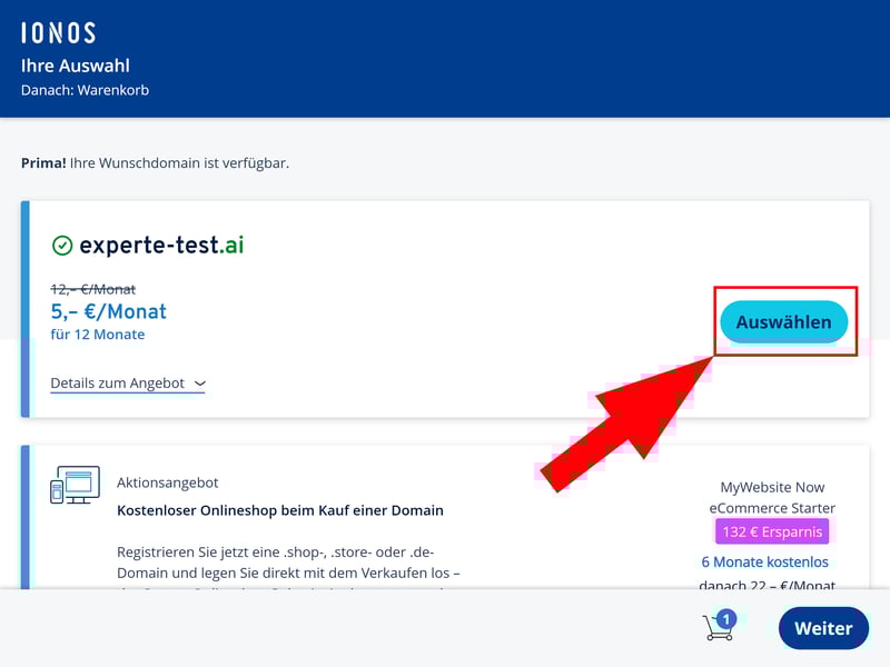 Wählen Sie die Domain aus und schließen Sie den Bestellvorgang ab.