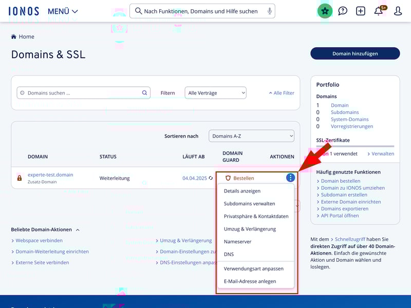 Nun können Sie Ihre Domain im Kundenbereich Ihres Domain-Anbieters verwalten und verwenden. Bei IONOS gelangen Sie zu den wichtigsten Einstellungen über das Dreipunkte-Menü in der Domain-Liste. Hier können Sie beispielsweise Domaindetails einsehen, Subdomains verwalten und Ihre Domain umziehen.