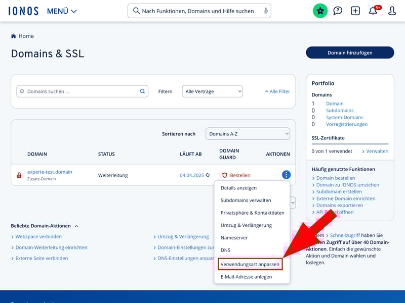 Schritt 2: Wählen Sie die Domain aus, die weitergeleitet werden soll, und klicken Sie auf den Dreipunkte-Button, um das Detailmenü zu öffnen. Dort klicken Sie auf „Verwendungsart anpassen“.