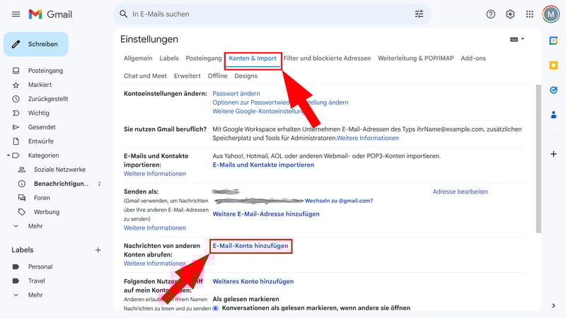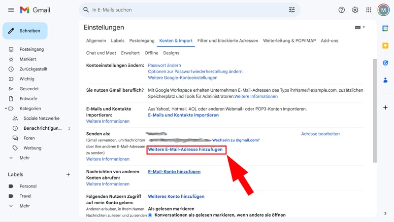 Bleiben Sie im Tab „Konten und Import“ und klicken Sie unter „Senden als“ auf „Weitere E-Mail-Adresse hinzufügen“.