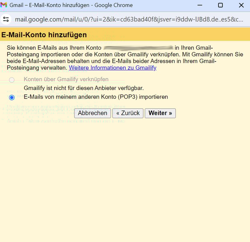 Wählen Sie „E-Mails von meinem anderen Konto (POP3) importieren“.